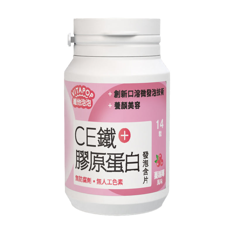 蔓越莓果汁(砂糖、蔓越莓果汁、麥芽糊精、檸檬酸、檸檬酸鈉、糊化澱粉、香料、紅甜菜萃取物、胭脂樹紅、梔子藍)、維生素C、檸檬酸、碳酸氫鈉、D-山梨醇(甜味劑)、微結晶狀α-纖維素、維生素E(維生素E、葡萄糖漿、辛烯基丁二酸鈉澱粉、二氧化矽)、甜菜(甜菜濃縮汁、麥芽糊精、二氧化矽)、葡萄糖酸亞鐵、聚乙烯吡咯烷酮、蔓越莓香料(乳糖、二氧化矽、β-環狀糊精、丙二醇)、膠原蛋白、硬脂酸鎂、蔗糖素(甜味劑)。