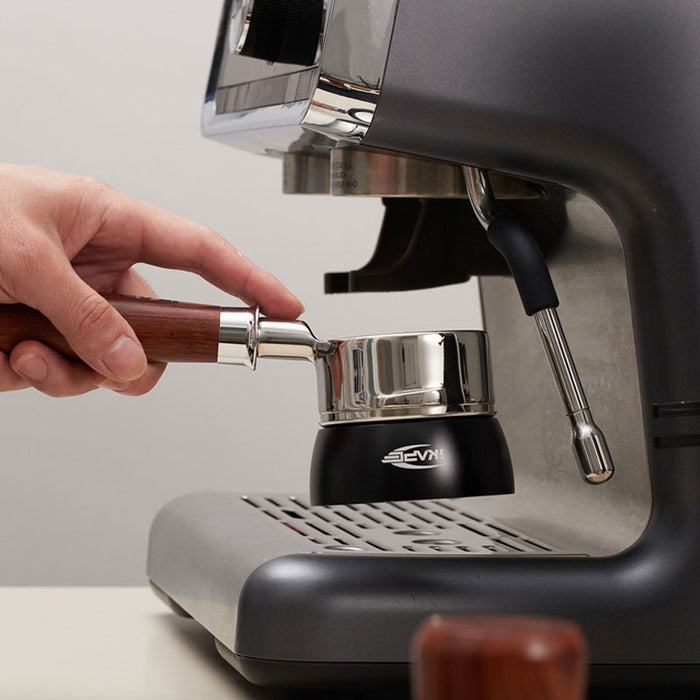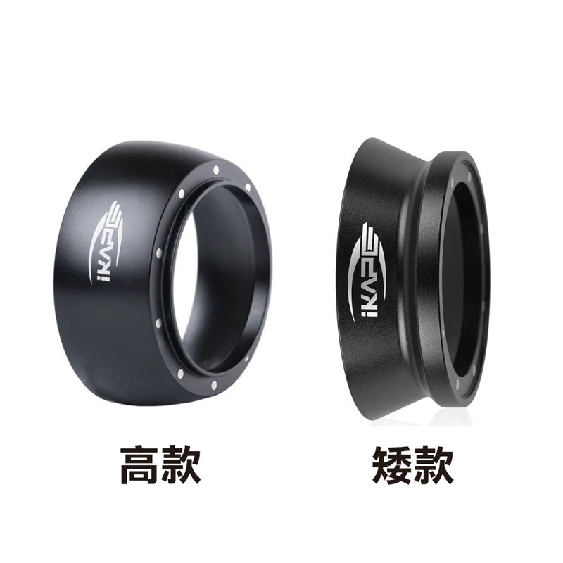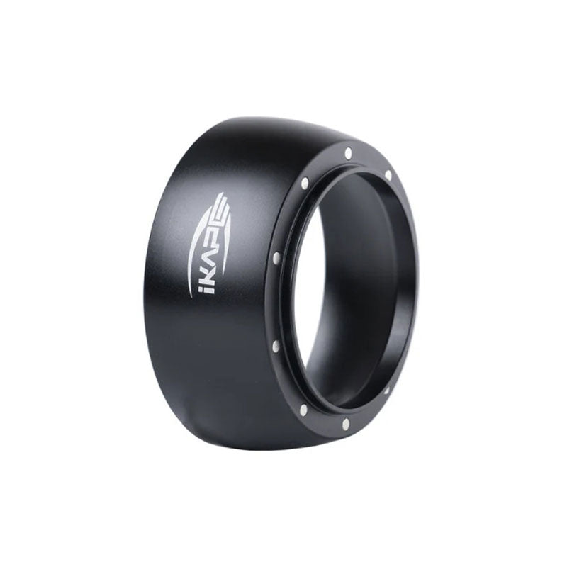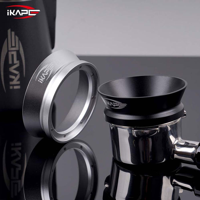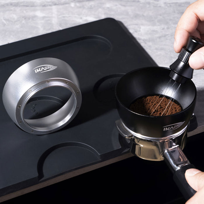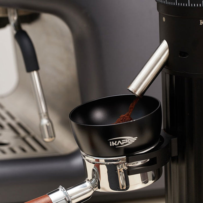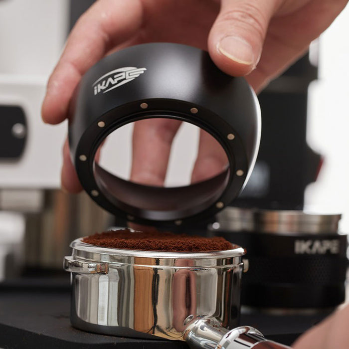 IKAPE 磁吸接粉環可穩定吸附於義式濾杯上方,協助在研磨、布粉、散粉過程中接住多餘咖啡粉,減少粉末外灑,讓操作流程更乾淨、順暢。